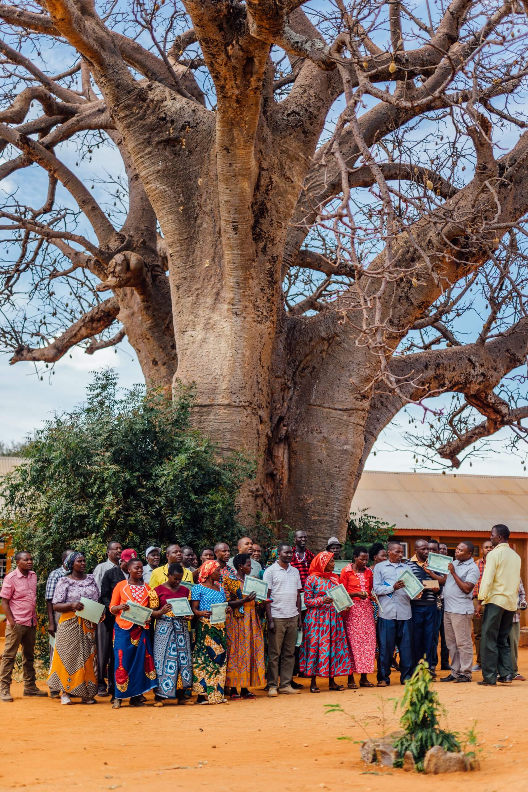 As part of our regreening mission, we aim to inspire and activate farmers in Africa to start regreening their own land. In our Treecovery project areas, we invite several well-respected and skilled farmers to become part of the Training of Trainers program. Here, we always aim for a balanced division of gender. By completing the training, they become Champion Farmers: ambassadors of regreening that help inspire and teach their fellow farmers in the community how to get started with regreening! Another way we inspire community members to regreen their land is by establishing grass seed banks and through a variety of communication tools. Examples of this are a weekly SMS service, movie roadshows, murals, and a regreening app providing tips and tricks on regreening.