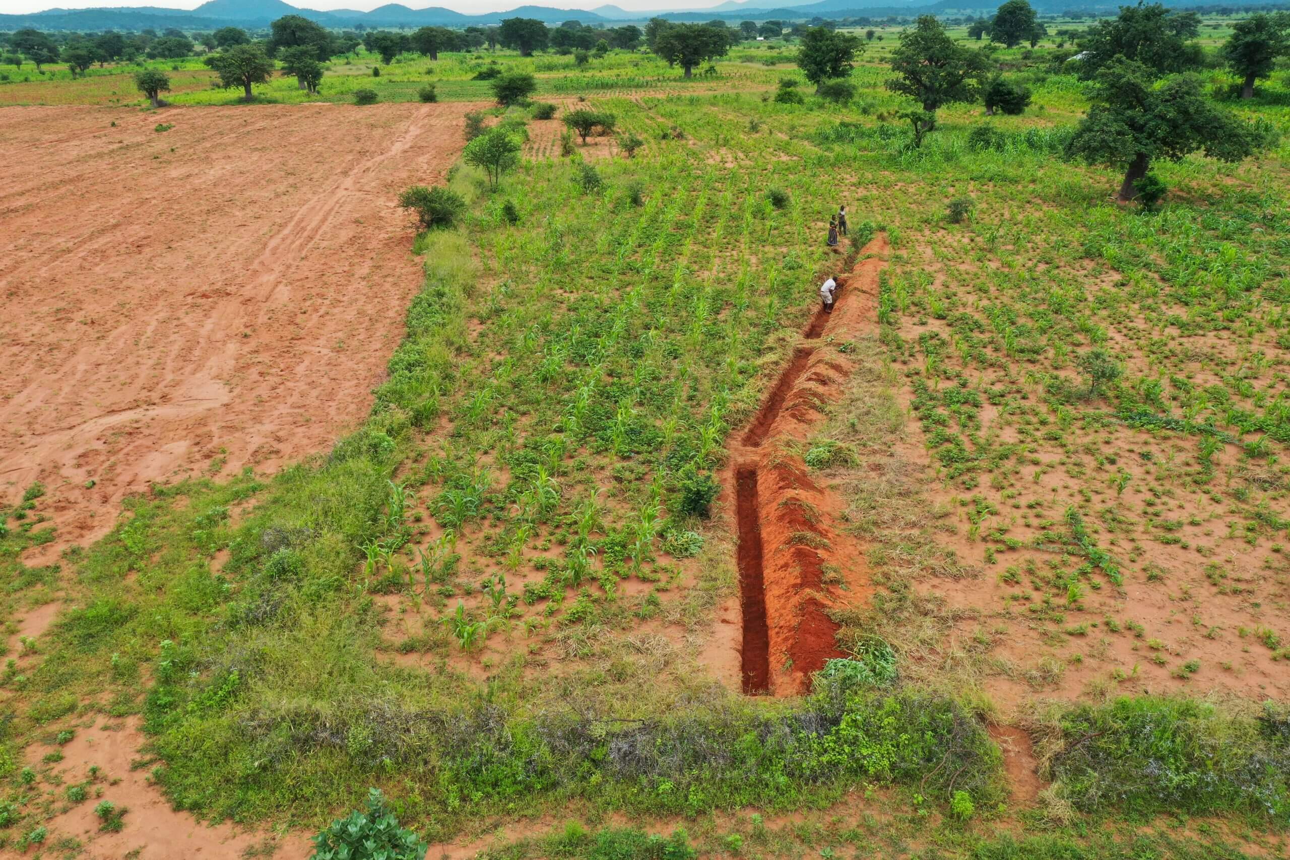 Yanachimbwa katika maeneo yetu ya mradi barani Afrika ili kuvuna maji ya mvua ambayo vinginevyo yatapita juu ya ardhi kavu, tasa. Kwa kuchimba makinga maji, tunaweza kukijanisha eneo kubwa kwa muda mfupi sana, kufaidika kwa bioanuwai, asili, watu na – mwishowe hali ya hewa yetu. Jifunze yote juu ya makinga maji!